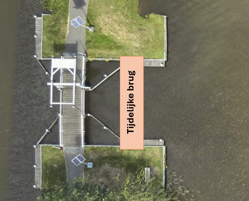 De tijdelijke werkbrug wordt naast de bestaande brug aangelegd. Dit is noodzakelijk om het werk veilig en efficiënt uit te voeren.